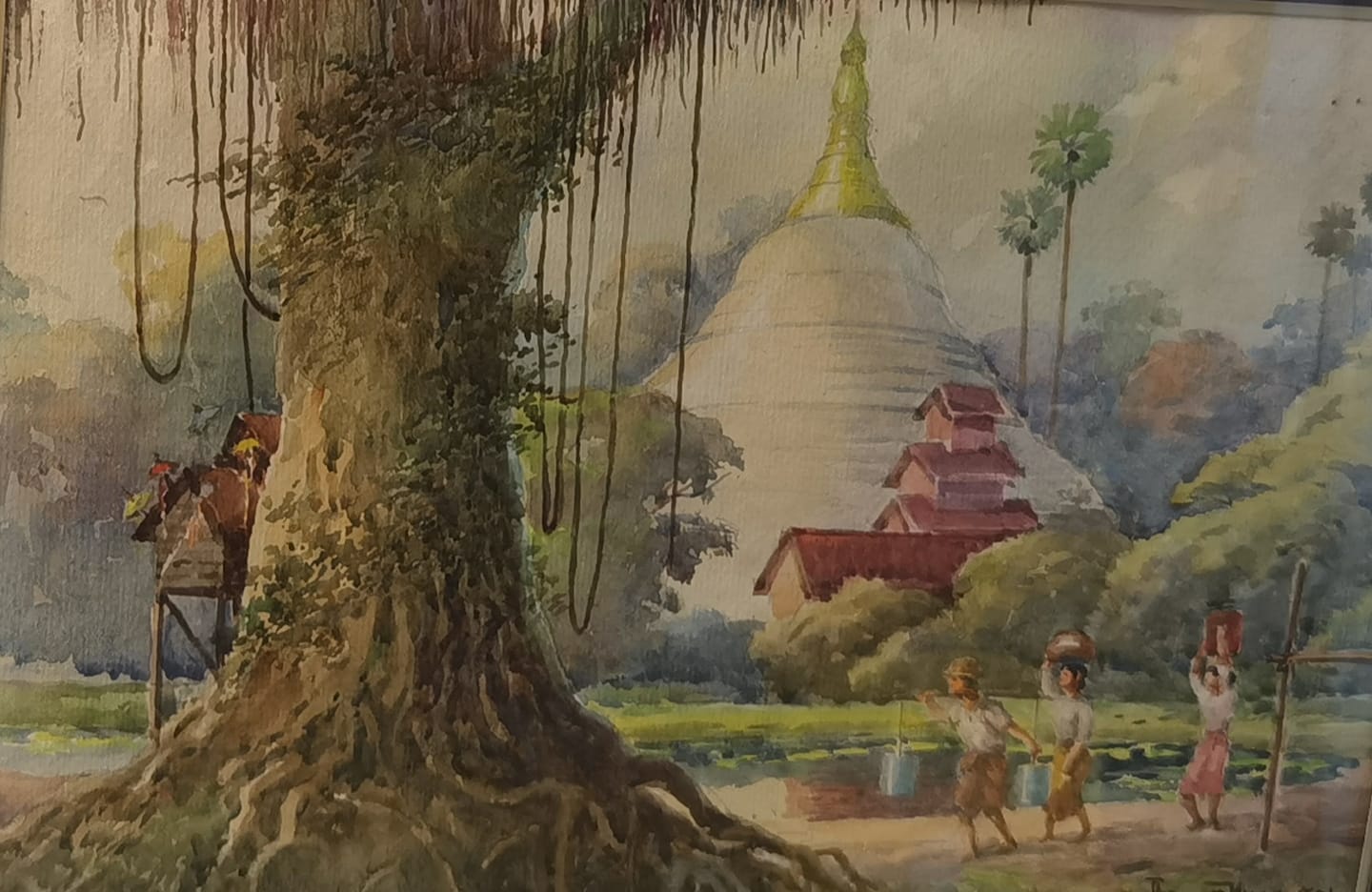 ပန်းချီဆရာကြီး ဦးသက်ညွန့်ရဲ့ပန်းချီကားဖြစ်ပါတယ်။ဆရာကြီးဦးသက်ညွန့်ဟာ သက်တော်ရှည်ပန်းချီဆရာကြီးဖြစ်သလို မြန်မာပန်းချီလောက သို့ဘက်ပေါင်းစုံးက ရှေ့ဆောင်ရှေ့ရွက်ပြုခဲ့သူတစ်ဦးဖြစ်ပါတယ်။ရေဆေးစက္ကူရှားပါးတုန်းက ရေဆေးစက္ကူကိုကိုယ်တိုင်ဖန်တီးခဲ့တယ်။(Acrylic)ဆေးကို ကိုယ်တိုင်တီထွင်ခဲ့ပါတယ်။ ခရုလေးတွေကနုကမာလေးတွေ ဆင်ယင်ထားတဲ့ ပန်းချီကားသေးတွေဖန်တီးပြီးစျေးကွက်တစ်ခုကို ခေါ်ဆောင်ကာ လူအများအလုပ်ရအောင် ကြိုးပမ်းပေးသူပဲဖြစ်ပါတယ်။ရေဆေးကားပေါင်းသောင်းနဲ့ချီရေးဆွဲခဲ့ပါတယ်္။ဒီကားမှာ ဘုရားပုထိုး၊ကျောင်း၊ဇရပ်၊ရေကန်၊ရေချမ်းစင် စတဲ့ကျေးလက်ရဲ့ အဂ်ါရပ်တွေကိုစုံလင်အောင်ဖော်ပြထားပါတယ်။တကယ်ရေးြပချင်တာက သစ်ပင်ကြီးမှာကပ်နေတဲ့ ကပ်ပါးပင်တွေဖြစ်ပါတယ်။အဲ့ဒီကပ်ပါးပင်တွေရှိနေတာကပဲ သဘာဝတရာကြီးဟာအနှောက်အယှက်အဖျက်အစီးမခံရသေးဘူးဆိုတဲ့သဘောကိုမြင်နိုင်ပါတယ်။ရိုးသလိုလိုနဲ့ မရုိးနိုင်တဲ့ကားပါ။ဆရာကြီးက ကိုမင်းကိုနိုင်ရဲ့ဖခင်ဖြစ်ပါတယ်။