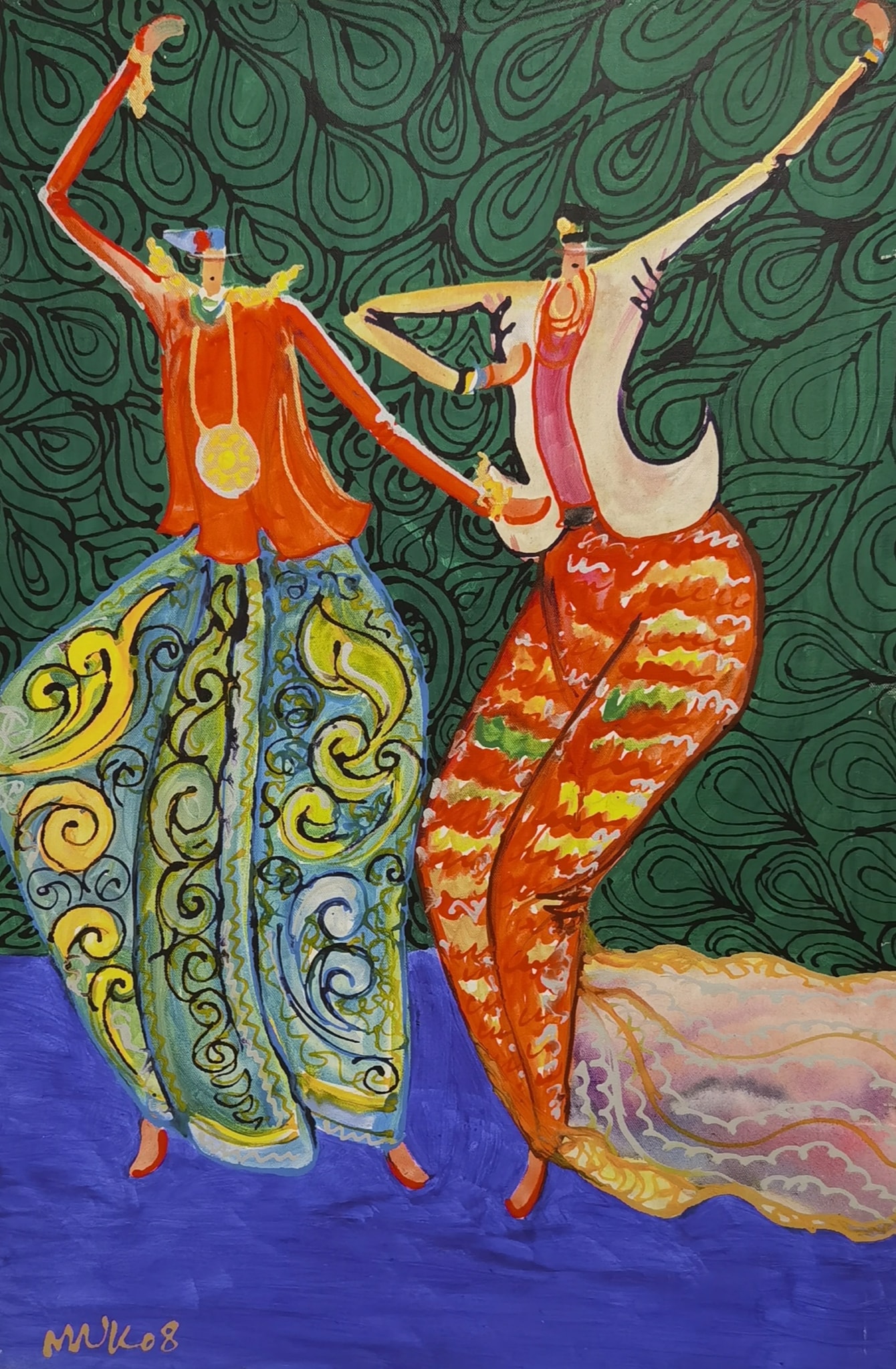 မိတ်ဆက်ပေးစရာ မလိုတဲ့ ပန်းချီ မျုိးညွန့်ခင်ရဲ့ ပန်းချီကားတစ်ချပ်ကိုမိတ်ဆက်ပေးလိုက်ပါတယ်။ ဒါဟာ သူရဲ့ အစောပိုင်းရေးတဲ့ပန်းချီလက်ရာဖြစ်ပါတယ်။ (Pop Art) အရောင်တွေနဲ့ ခပ်ပျော့ပျော့ မျဥ်းတွေရောစပ်ပြီးရေးထားပါတယ်။အသာကလေးမျှောပြီး လိုက်ချင်စရာကောင်းတဲ့ စိတ်ကူးယဥ်မျဥ်းကွေး ဒီပန်းချီကားမှာ အလွှမ်းမိုးဆုံးပါပဲ။ တစ်ချို့ကသူအရုပ်ကို ကာတွန်းဆန် တယ်လို့ ပြောကြပေမဲ့ တကယ်တော့ အချိုးဖျက်ခြင်းမျှသာဖြစ်ပါတယ်။ ပန်းချီမျိုးညွန့်ခင် ဟာ Acrylic ကို ရေဆေးလို မျှောရေးရမှာအလွန်တော်ပါတယ်။ သူရဲ့ အရုပ်တွေဟာ ခေါင်းသေးသေးလေးတွေပါရှိပါတယ်။ အဲ့ဒီခေါင်းသေးသေးလေးတွေဟာ အခြေအနေတစ်ရပ်မှာ ပျော်ဝင်မှုတစ်ခုလို့လဲ ဆိုချင်ပါတယ်။ (mood) တစ်ခုနောက်ကို လိုက်တဲ့ အခါမှာ အလိုလိုနေရင်း လျော့ပါးသွားတဲ့ အတ္တရဲ့ လျော့ပါးမှုတစ်ခုပါ။နောက်ပိုင်းမှာ သူရဲ့ လက်ရာတွေအမျိုးမျိုးပြောင်းလဲပေမဲ့ (mood)တစ်ခုကို ဖမ်းတာအရမ်းကောင်းပါတယ်။ နောက်ထပ်သူ ကားတွေတင်တဲ့အခါ ဆက်ပြီးလေ့လာကြည့်ကြပါ။